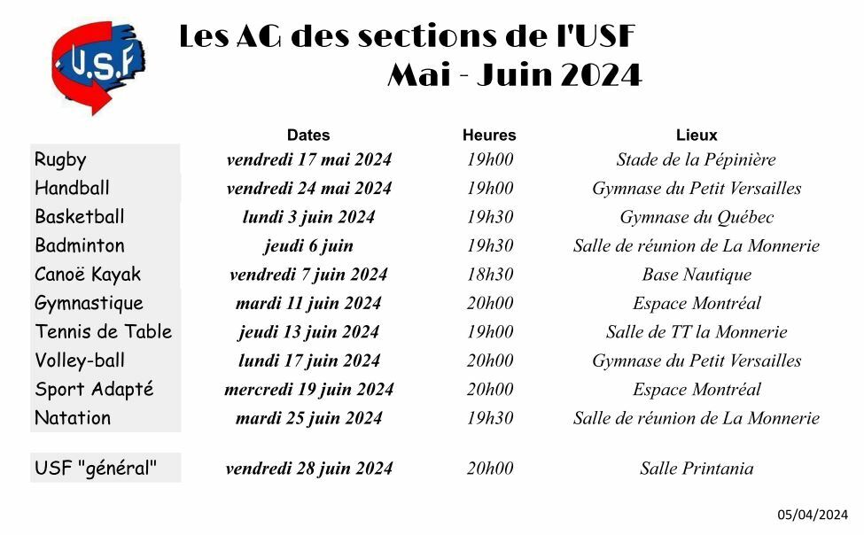 Veuillez trouver le calendrier des Assemblées Générlaes des Sections de l'USF y compris celle de l'USF général.