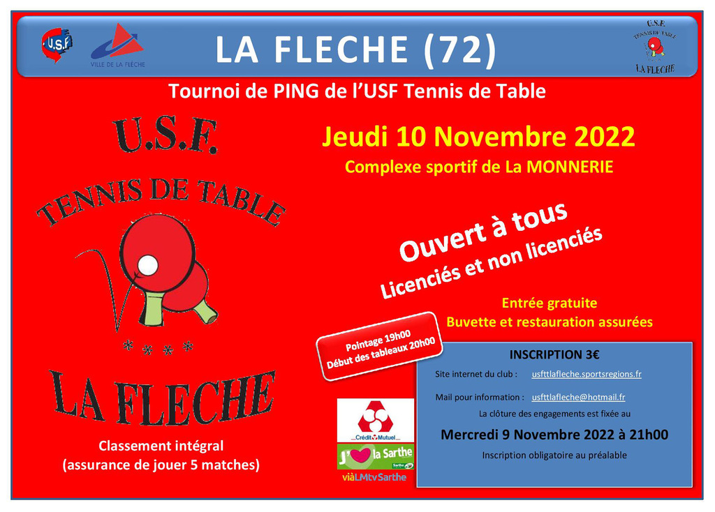 L'USF Tennis de Table a organisé son Tournoi Loisirs quia débuté le jeudi 10 novembre. Il est ouvert à toutes et tous même non licencies. Toutes les informations sur la page du club.